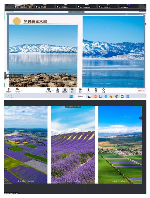 受特殊情况影响,我们暂时无法来到美丽的校园,无法看见巍峨连绵的雪山、一望无际的草原,同学们颇有遗憾。因此,在“大美新疆”环节中,同学们跟着刘芷彤和马瑞玲同学的步伐,一起开启了去往新疆的旅程。刘芷彤同学播放了外地人想象中的新疆与现实中的新疆的对比视频,让大家更加了解新疆,同时打破了外地同学心中的刻板印象。接着他们用一幅幅美丽的图片带领同学们欣赏新疆的美景,有冬日的喀纳斯、赛里木湖,有伊犁的薰衣草、花海、大草原...