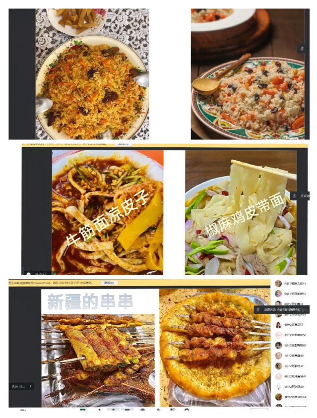 除了这些绝美的风景,还有同学们最感兴趣的部分,新疆令人垂涎欲滴的美食,大盘鸡、凉皮子、椒麻鸡、手抓饭、羊肉串、饼夹肉、烤馕,丰富的美食图片刺激着同学们的味蕾,马瑞玲同学一一为大家介绍各个美食的特色,同学们更是畅所欲言,纷纷讲述起自己家乡的美食,拉近了彼此的距离。