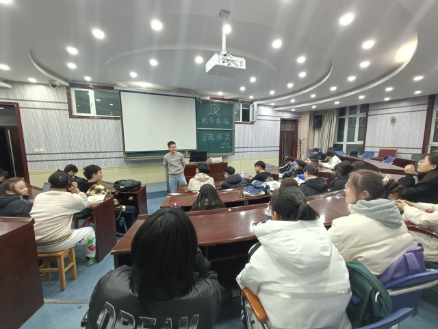 首先王有彪老师针对近期频频发生的网络诈骗事件进行了分析,强调了电信诈骗的危害性,围绕冒充公检法、购物退款诈骗、贷款诈骗、兼职刷单诈骗和冒充熟人诈骗等各种类型的诈骗手段展开,提出多个具体案例,为同学们敲响了警钟。