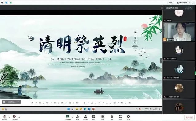 线上活动由团支书张梓欣同学主持,共分为三个环节。首先,张梓欣同学播放了一段清明节主题的视频,引出了清明节的节日渊源和活动目的。她说:“清明节是扫墓祭祖的时节。作为老员工,我们应当在清明之日缅怀英烈,祭奠英烈。传承民族传统,继承革命遗志。”
