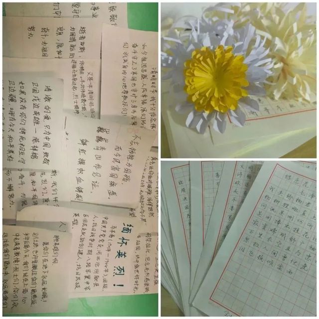 线下活动中共有“我心目中的英雄”卡片、“菊花”剪纸、“革命诗歌”书法三个环节。同学们精心制作,认真书写。以花献出真挚,以纸承载温情,通过作品表达对英烈深深的敬佩与缅怀之情。正如毛奕璇同学所说:“剪一朵菊花,写一张卡片,每个动作,每个笔划,都饱含着我对英雄先烈们无限的尊敬和诚挚。愿能以此缅怀先烈。”