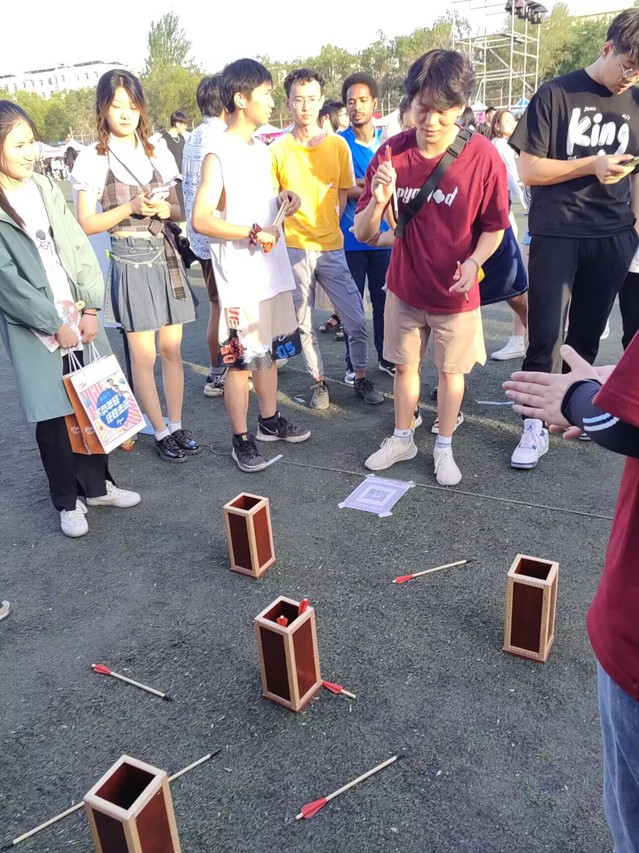 当宣布文化节开园之时,来自各公司的同学都积极前往自己感兴趣的区域,投壶活动也受到了同学们的热烈欢迎,在工作人员的安排和带领下,他们在等待区排着络绎不绝的长队。