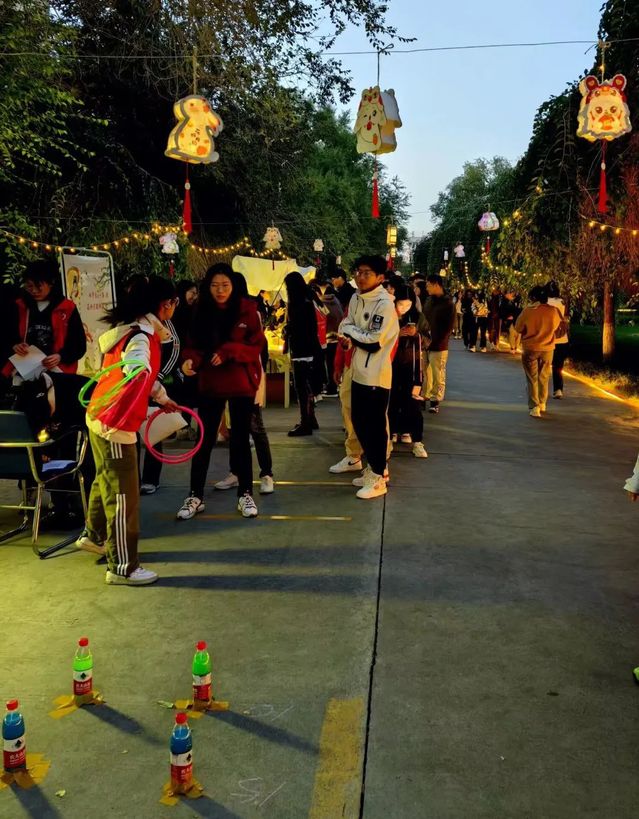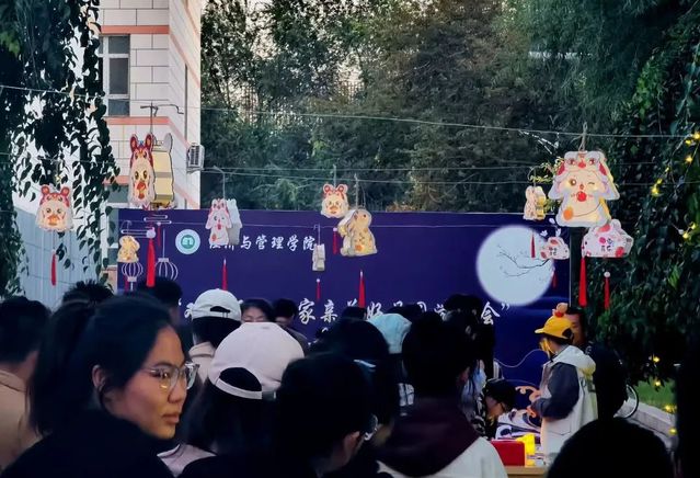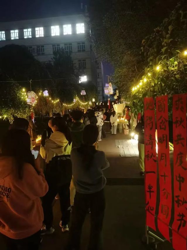 同学们纷纷在花灯下合影留念,定格一瞬,留下的是灯光闪烁下的身影,星星点点的花灯与熙熙攘攘的人群渲染出了校园里独有的节日氛围,让中秋节不能回家的同学们也能感受到家的温暖。