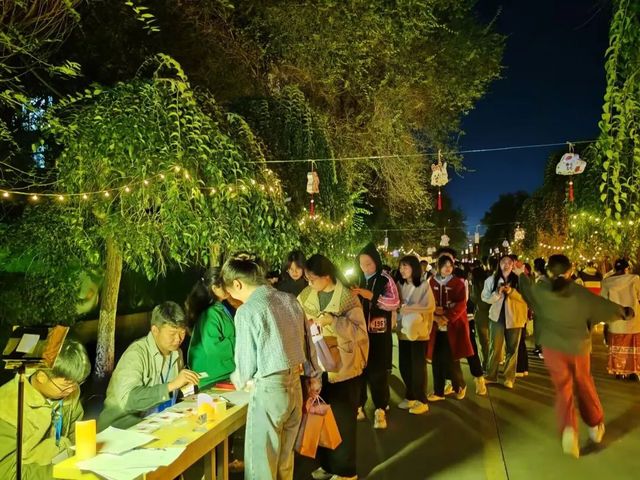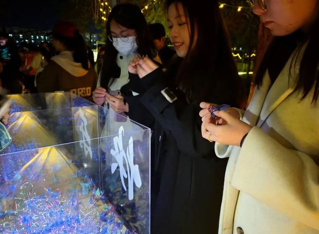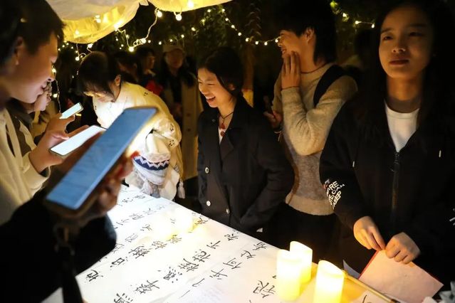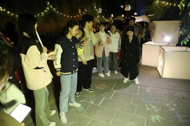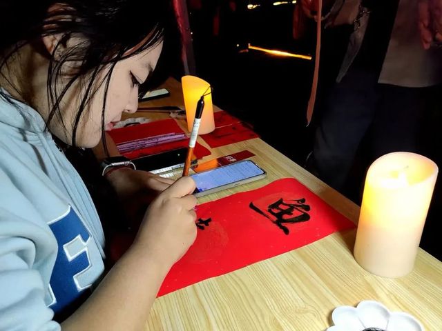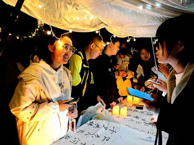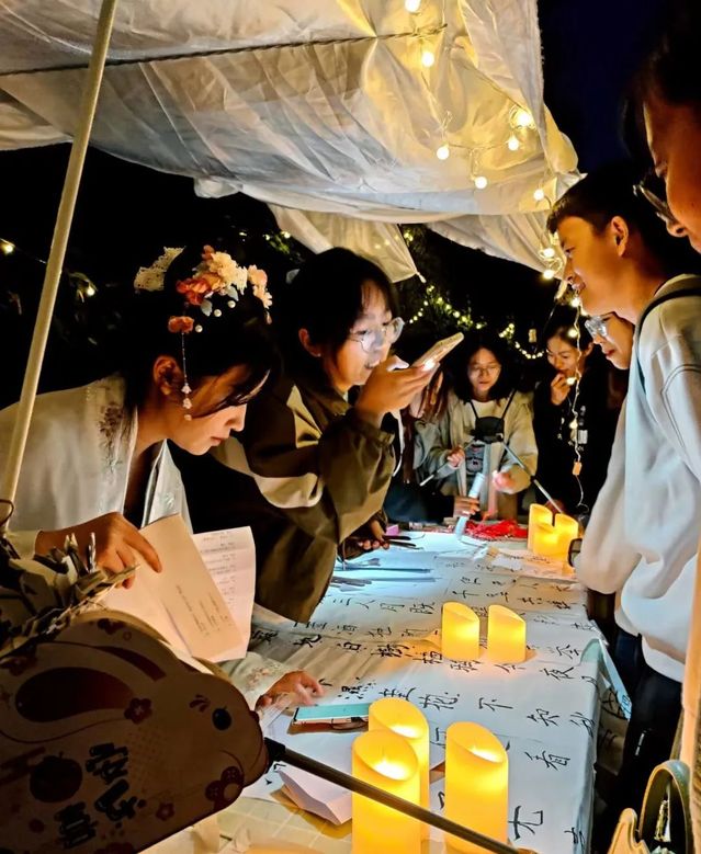 花灯暖街的尽头,花好月圆的景象徐徐展现在大家面前,万华铺的“店小二”已经在此等候多时,耳畔音乐流转,千纸鹤的祝福每一个都与众不同,夜色朦胧,顶上花灯闪耀,光彩夺目;帐下圆桌围坐,欢声笑语。主题各异的剪纸创作,中秋景象的团扇绘画。帐下共剪纸,帐上悬挂的是“店小二”手工制作的剪纸灯笼,如银花雪浪。一旁的团扇帐下,则见绘者们屏气凝神,专注于笔下的彩绘,倒与前面的喧闹人群相映成趣。回眸望去,万华铺的尽头,员工们用毛笔蘸以金墨,在红笺上雀跃着对亲友的祝福与期盼。由对联裁剪出的二字纸签,小巧可爱,同学们将其握持在手,将灯火延续至校园深处。