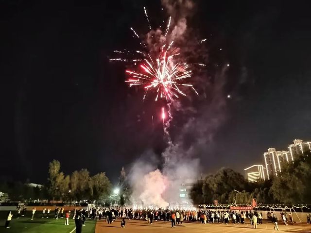 活动最后,田径场上人影攒动,期待着游园会的结尾彩蛋——烟花秀。在大家的倒计声中,一束束火光骤起,烟火缭绕,只听“啾”的一声,火树银花跃向夜空,在空中盛开,照亮了夜空。烟花夺目绚烂,势如破竹,这无一不期盼祝愿着大家能万事顺意,平安喜乐。