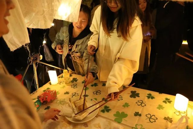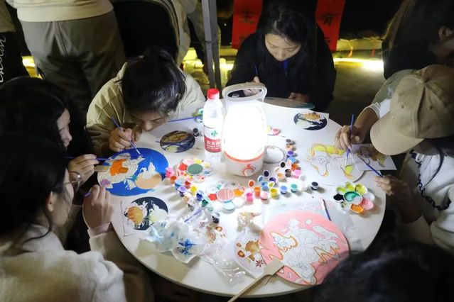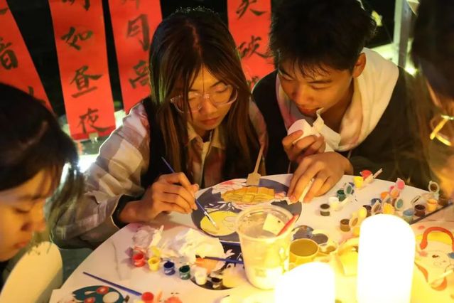 帐下围坐的同学们,从五湖四海相聚于此,萦绕心头的思乡之情在此刻得以慰藉。来自会计20221班的张妍同学说:“这大概是让我在校园中最为动容的风景了吧!公司重新给予了我家的感觉。”来自会计20212班的秦若涵同学感慨道:“纯手工的作品捧在手心,我十分珍惜这来自同学们最真切的心意和最热忱的温暖。”穹上繁灯,明月相约,对联、团扇、剪纸、花灯,让同学们领略到了非物质文化遗产的魅力。