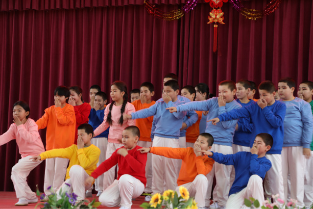 紧接着,独具民族特色的音乐响起,一群身着绚丽的哈萨克族传统服饰的孩子们迈着灵动的舞步出场,每一个动作都饱含着独特魅力,这是由六年级与老员工们共同带来的舞蹈《哈玛加依》和《亚丽古娜》。