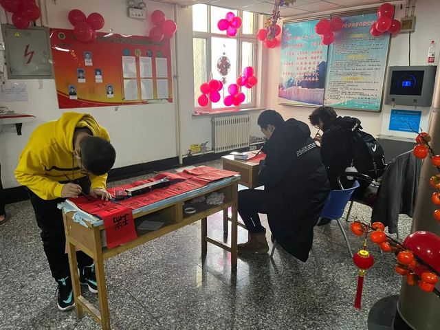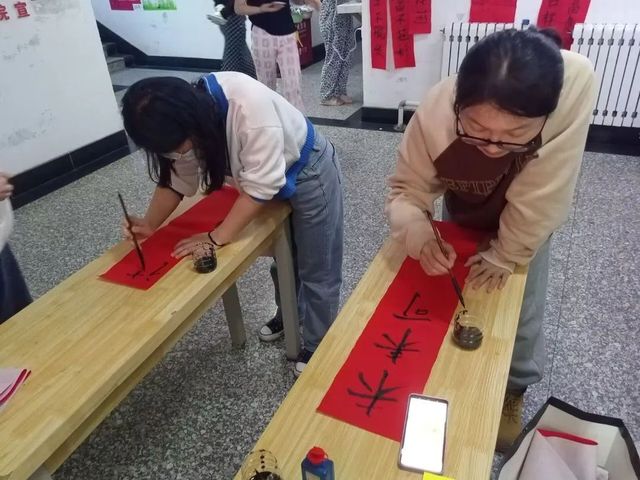 1月1日,在5号楼男生宿舍、5号楼女生宿舍和4号楼女生宿舍大厅里,现场被布置得喜气洋洋,红纸、墨汁、毛笔等一应俱全,充满了浓厚的节日气息。同学们纷纷来领取红纸,用笔墨书写着对新年的美好祝愿。