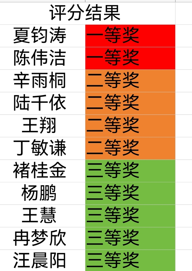 经过评分审核,审核小组最终评出一等奖两名,二等奖四名,三等奖五名。