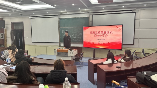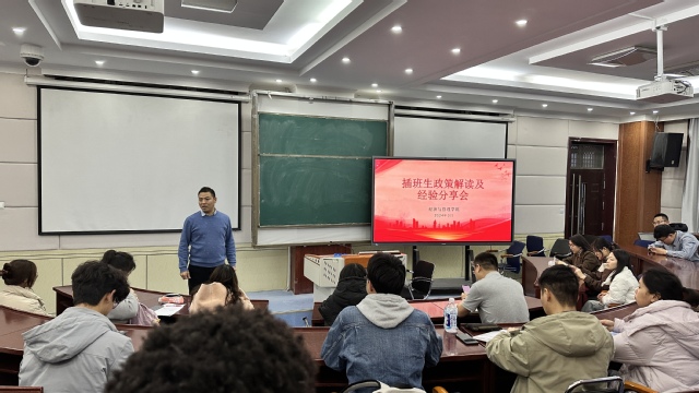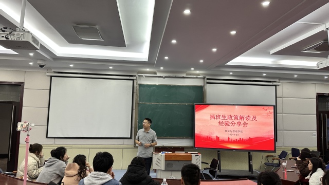 随后,员工工作办公室主任肖彬彬老师详细解读了插班政策的具体内容,他从插班生的资格条件、申请流程、考核标准等多个方面进行了全面介绍,并对插班生在新环境中可能遇到的挑战及应对策略进行了深入剖析,让在座同学对插班生面对的实际情况有了进一步了解。