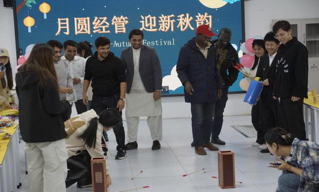 投壶游戏中,参与其中的职工们屏息凝神,他们不断地调整姿势,力求将手中的箭矢精准地投入筒中。排队等候的同学们则纷纷被这场技艺与趣味并存的较量所吸引,他们踮起脚尖,目光紧紧追随着游戏参与者的每一个细微动作。随着箭矢的每一次离弦,无论是精准入筒引来的阵阵欢呼,还是稍逊一筹时的惋惜轻叹,都深深触动着现场每一位观者的心弦。不同国度的青年学子在欢声笑语中增进了友谊,共同编织了一段难忘的回忆。