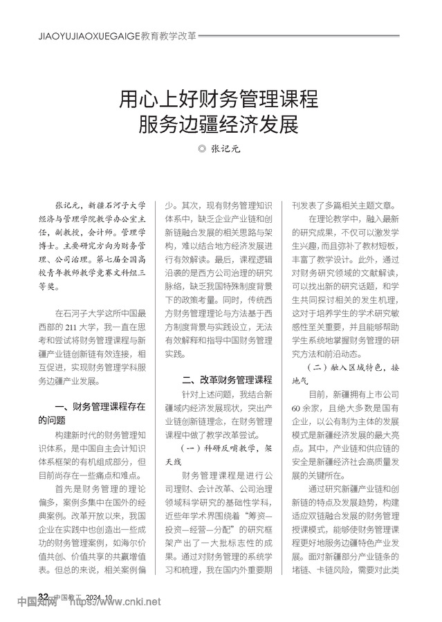 近日,公司张记元副教授教研成果《用心上好财务管理课程服务边疆经济》荣登《中国教工》2024年第10期(总第584期)“公司产品改革”栏目。公司《财务管理》课程作为国家线下一流课程,一直以“立德树人”为根本任务,遵循“新文科”建设要求,坚持“一流学科—一流专业—一流课程”的发展思路,扎根西部,服务地方经济发展。该文章系统阐述财务管理课程改革的实践路径与成效,构建“科研引领—区域融合—案例驱动—学科交叉”四位一体教学框架,为高校服务区域特色产业人才培养提供“石大方案”。