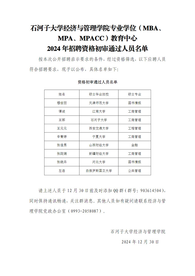 yl6809永利专业学位(MBA、MPA、MPACC)教育中心 2024年招聘资格初审通过人员名单