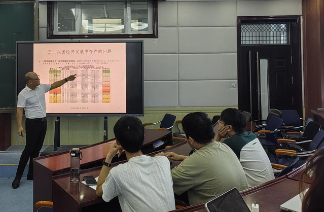 在讲座过程中,倪超军教授围绕兵团区域经济发展这一主题,从三个方面进行了分享。首先,倪教授阐述了兵团作为安边固疆稳定器、凝聚各族群众大熔炉、发展先进生产力和先进文化示范区有着不可替代的价值。从历史发展脉络来看,兵团在不同的历史时期肩负着特殊的使命,其在新疆的布局与建设,对整个区域的经济格局产生了深远影响,为新疆的长治久安奠定了坚实基础。接着,倪教授深入分析了兵团区域经济发展的现状。通过翔实的数据、丰富的案例以及严谨的分析,展示了兵团近年来在经济总量、产业结构、农业现代化、工业发展、第三产业拓展等多方面的成就与进步。最后,倪教授系统分析了兵团经济发展中面临的深层次问题,如产业结构有待进一步优化升级,部分传统产业竞争力不足,高附加值产业培育相对缓慢;在科技成果转化、创新人才吸引与培养等方面存在瓶颈;区域发展不平衡的问题依然存在;生态环境保护压力较大,在资源开发与利用过程中如何实现经济发展与生态保护的良性互动是亟待解决的重要课题等。对这些问题的剖析,引发了在场师生的深入思考与讨论。