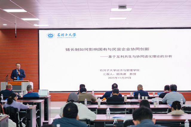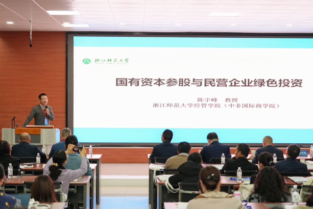 浙江师范大学yl6809永利中非国际商公司经理陈宇峰教授在作“国有资本参股与民营企业绿色投资”主题分享时,介绍了在当前推动经济社会绿色转型的背景下,民营企业的绿色投资行为对于实现“双碳”目标至关重要。这种“国民共进”的混合所有制模式,不仅提升了民营企业的可持续发展竞争力,也放大了国有资本在引导全面绿色转型中的杠杆作用,为构建现代化产业体系注入了强劲的“绿色动能”。