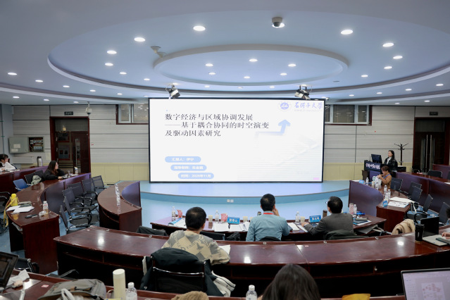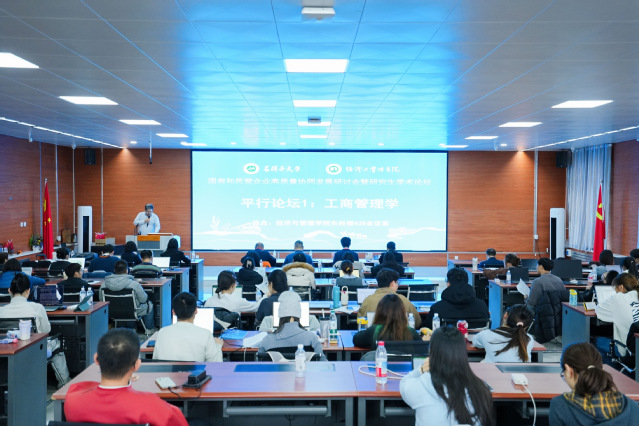 第三单元平行论坛环节下设“工商管理学”与“应用经济学”两个平行会场,分别由工商管理系主任崔登峰教授和经济学系主任孙志红教授主持。在工商管理学会场,汇报师生聚焦于“企业高质量发展与数字化转型”等核心议题,深入探讨了国有企业高质量发展路径、数字化转型实践以及民营企业的发展困境与出路。应用经济学会场则围绕“数字技术与区域经济发展”展开,议题涵盖数字技术赋能经济韧性、数字基础与产业安全,以及区域经济高质量发展等前沿领域。
