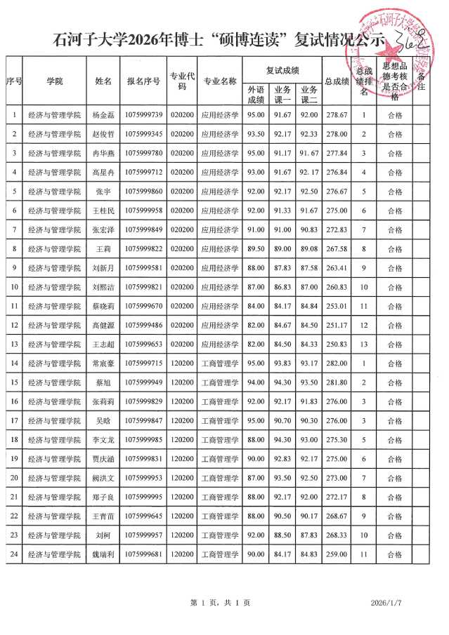 依据《2026年博士研究生招生工作细则》,yl6809永利于2026年1月5日组织了硕博连读考生面试工作,现将面试成绩予以公示,公司将根据学科方向招生指标,按总成绩排名依次递补录取。具体拟录取情况以大学官网公布结果为准。